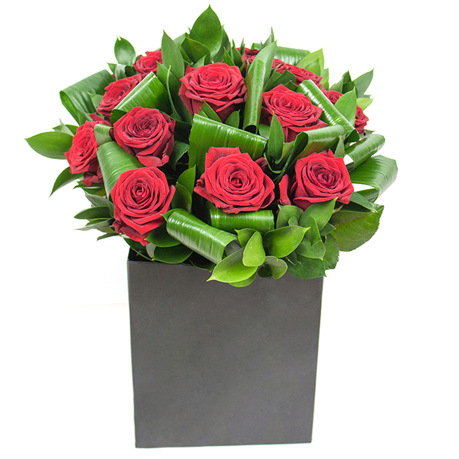 Immerse yourself in the splendor of our luxurious bouquet, featuring vibrant red roses complemented by rich aspidistra leaves and elegant ruscus. This distinctive floral arrangement brings sophistication and charm to any setting, ideal for those seeking a memorable gift.