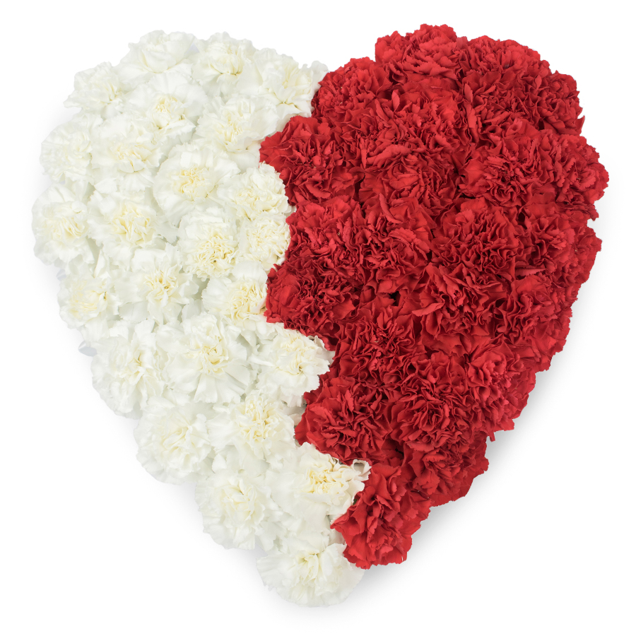 Introducing our beautiful Heart-Shaped Carnation Arrangement, expertly designed by Handy Flowers. This elegant bouquet features a harmonious blend of white and red carnations, perfect for expressing your deepest sympathies with grace and style.